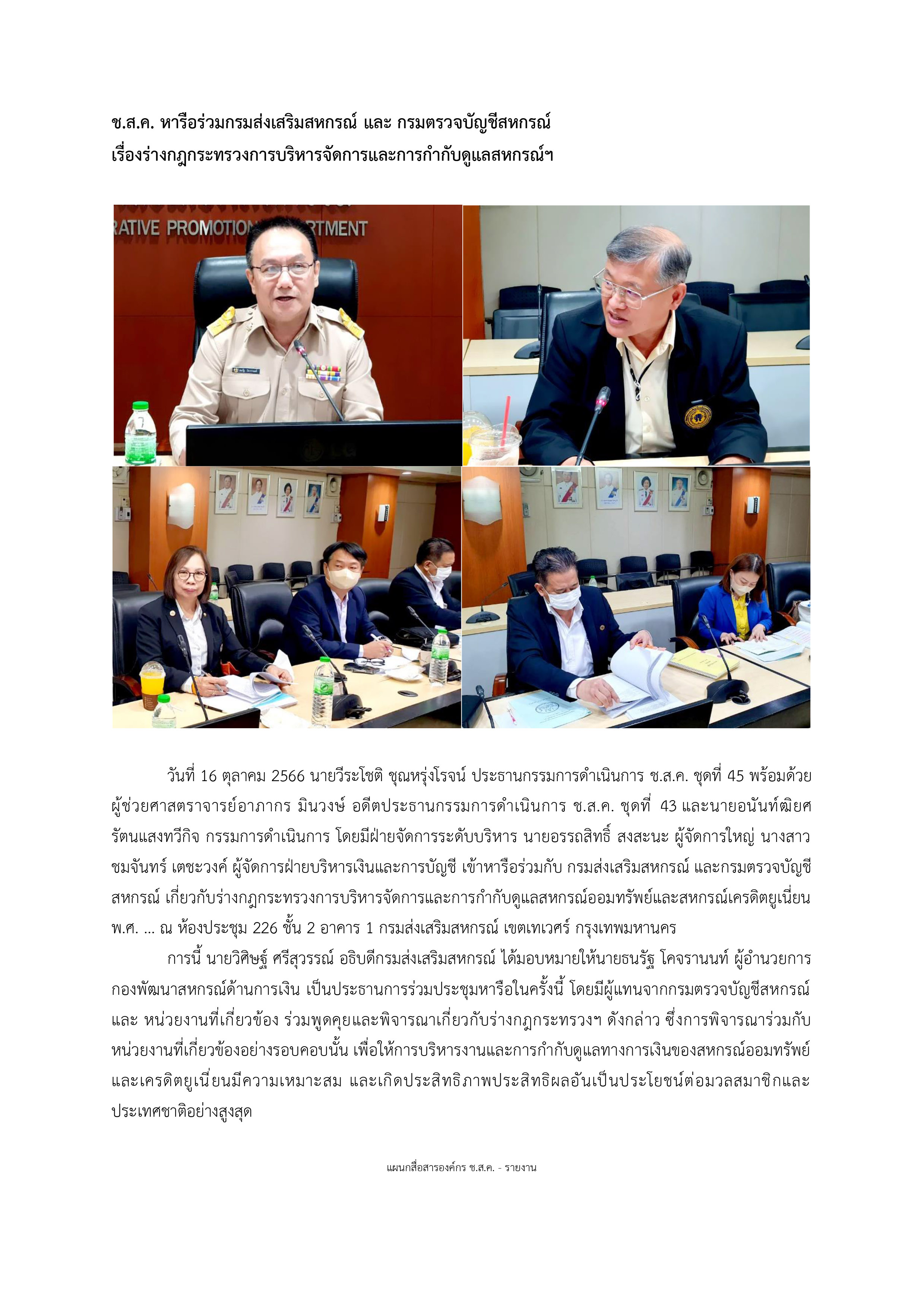 ข่าวประชาสัมพันธ์ ช.ส.ค. หารือร่วมกรมส่งเสริมสหกรณ์ และ กรมตรวจบัญชีสหกรณ์ เรื่องร่างกฎกระทรวงการบริหารจัดการและการกำกับดูแลสหกรณ์ฯ