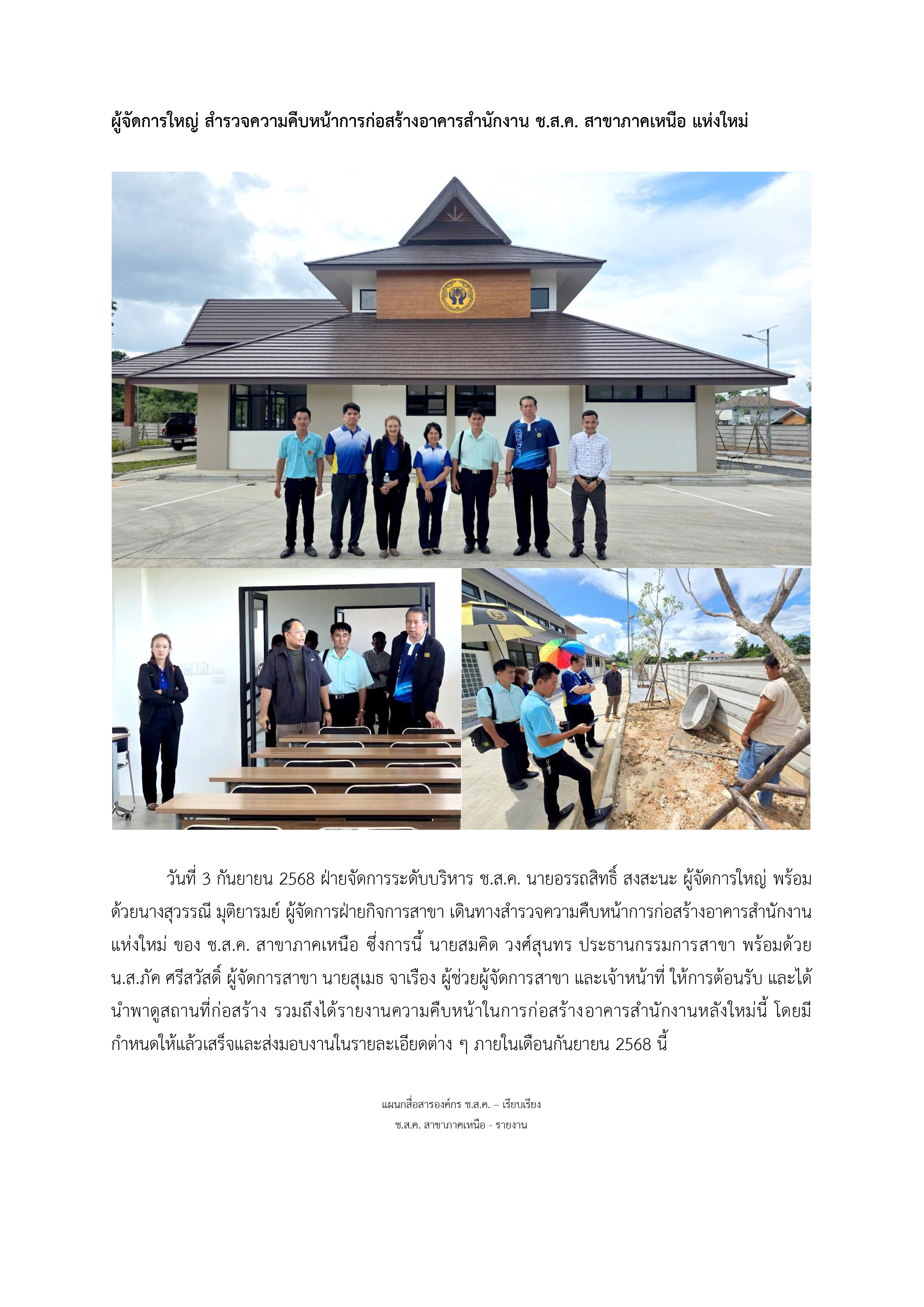 ข่าวประชาสัมพันธ์ ผู้จัดการใหญ่ สำรวจความคืบหน้าการก่อสร้างอาคารสำนักงาน ช.ส.ค. สาขาภาคเหนือ แห่งใหม่