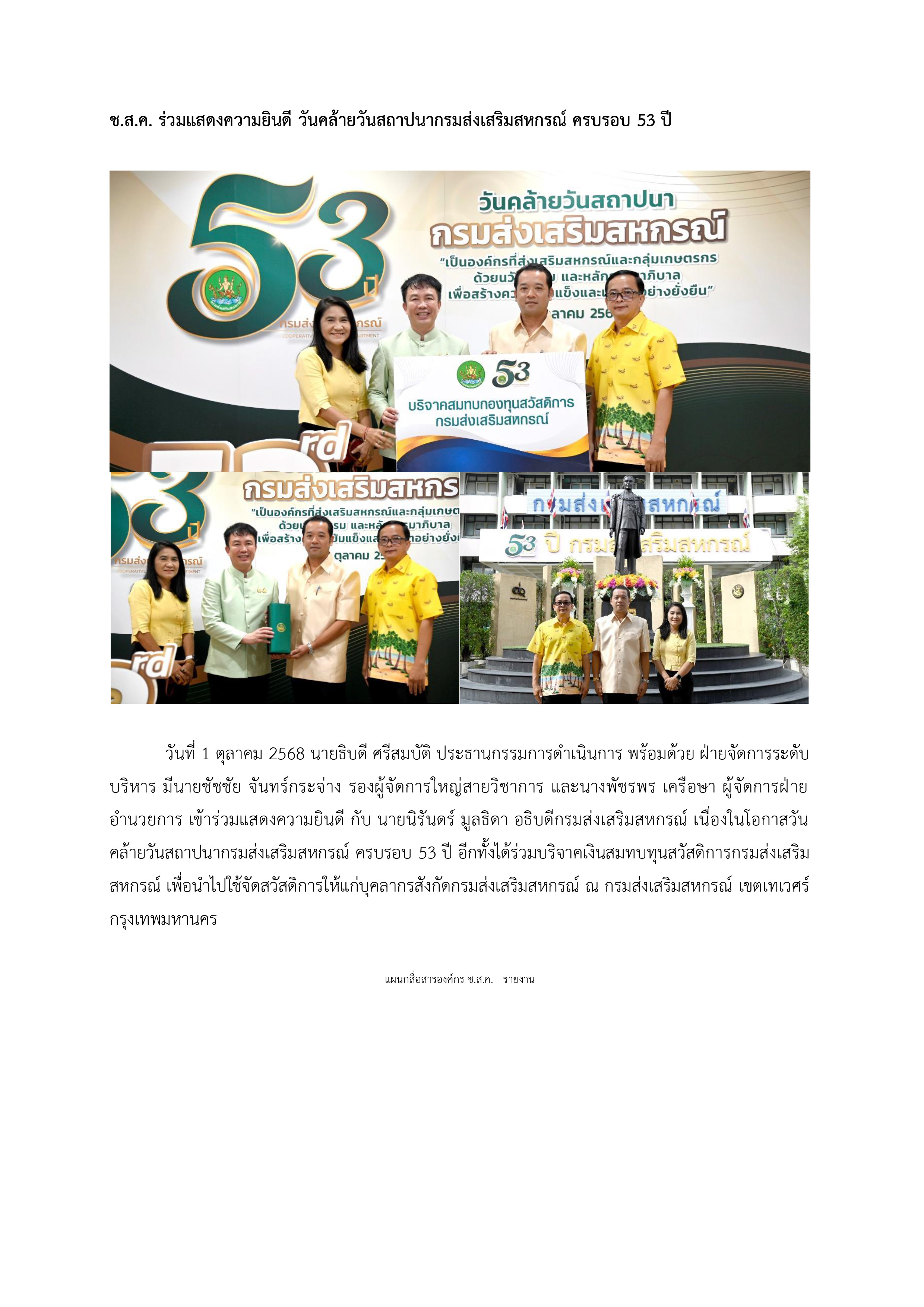 ช.ส.ค. ร่วมแสดงความยินดี วันคล้ายวันสถาปนากรมส่งเสริมสหกรณ์ ครบรอบ 53 ปี