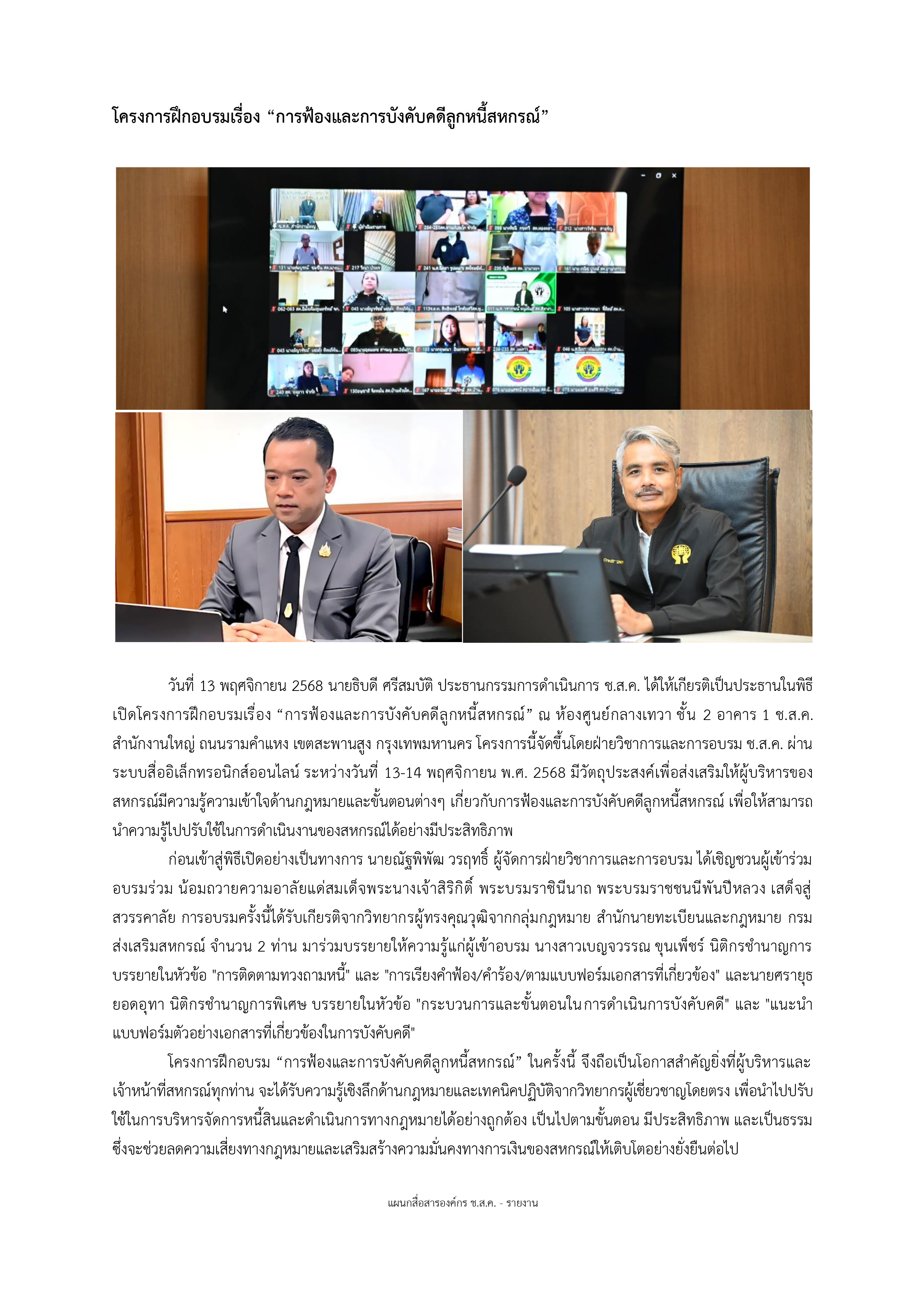 โครงการฝึกอบรมเรื่อง “การฟ้องและการบังคับคดีลูกหนี้สหกรณ์”