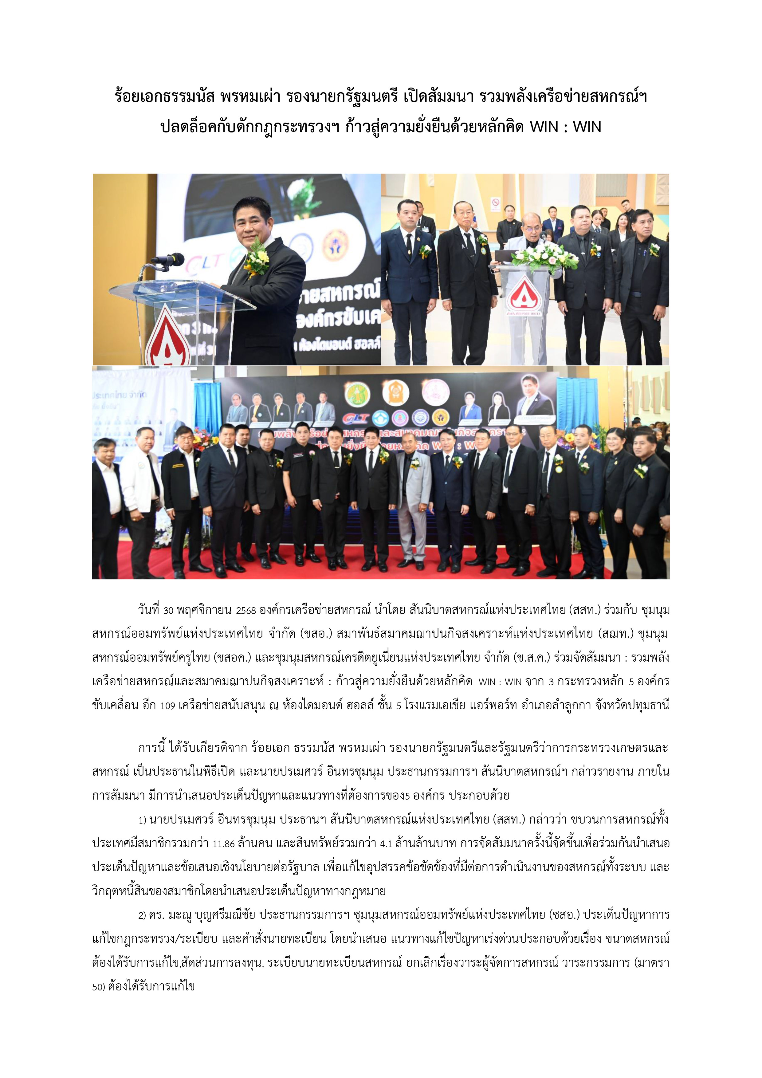 ข่าวประชาสัมพันธ์ ร้อยเอกธรรมนัส พรหมเผ่า รองนายกรัฐมนตรี เปิดสัมมนา รวมพลังเครือข่ายสหกรณ์ฯ ปลดล็อคกับดักกฎกระทรวงฯ ก้าวสู่ความยั่งยืนด้วยหลักคิด WIN : WIN