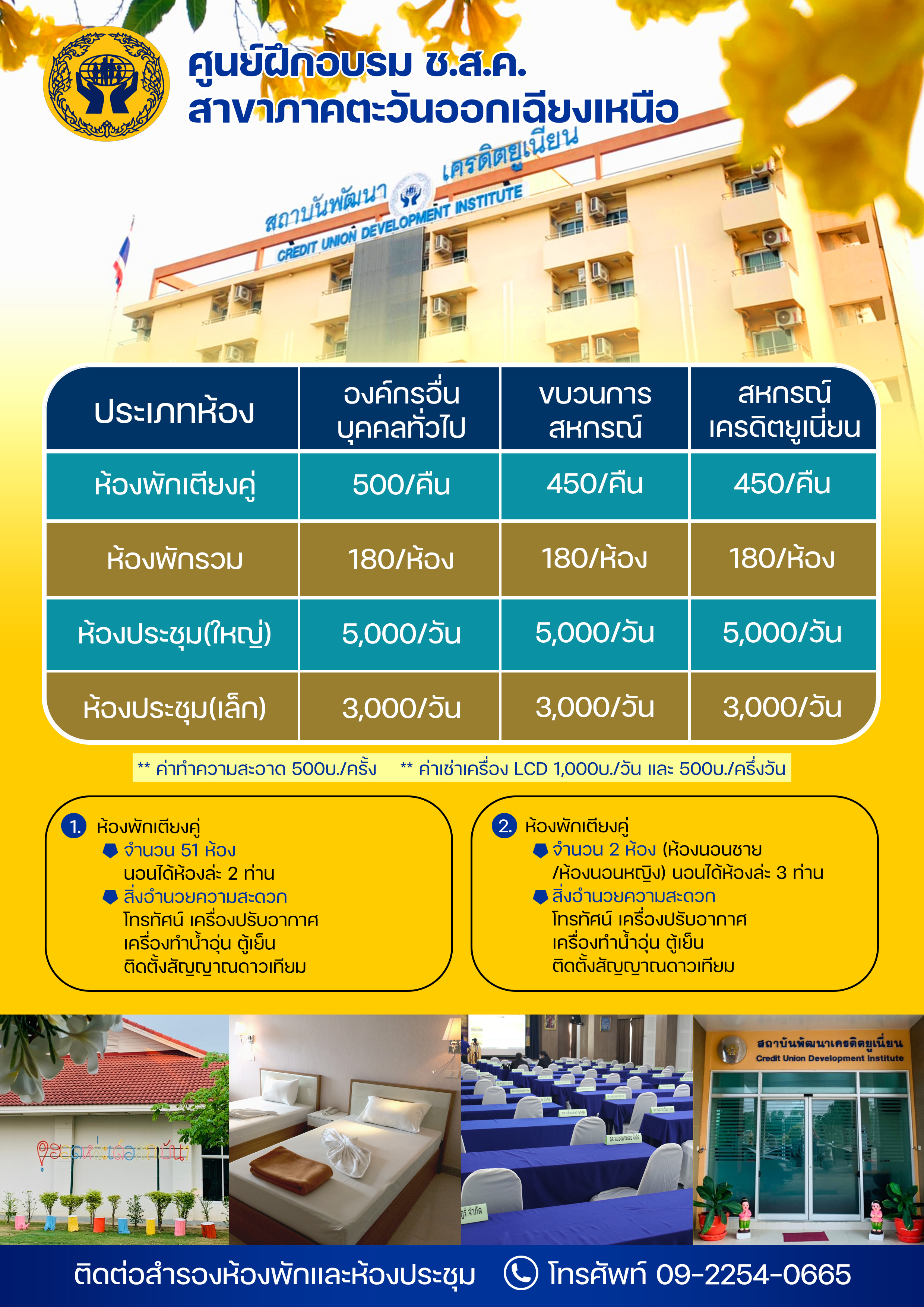 สถาบันพัฒนาเครดิตยูเนี่ยน จัดตั้งขึ้นโดยชุมนุมสหกรณ์เครดิตยูเนี่ยนแห่งประเทศไทย จำกัด เมื่อปี พ.ศ. 2555 เพื่อทำหน้าที่เป็นสถาบันในการพัฒนาบุคลากรของขบวนการเครดิตยูเนี่ยนและบุคคลทั่วไปในทุกระดับ ให้มีศักยภาพในทุกด้าน ไม่ว่าจะเป็นความเข้าใจในการบริหารงานสหกรณ์ฯ บทบาทและหน้าที่ของคณะกรรมการ และผู้ตรวจสอบกิจการจัดการอบรมโครงการเจ้าหน้าที่สหกรณ์ สร้างเครือข่ายการติดต่อประสานงานร่วมกัน แม้กระทั่งการให้ความรู้เกี่ยวกับเรื่องของการตรวจสอบภายในขบวนการสหกรณ์ ตลอดจนเปิดรับบุคคลภายนอกให้มีความรู้ความเข้าใจทั้งทางทฤษฏี และฝึกปฏิบัติเพื่อรองรับความเจริญเติบโตทั้งปัจจุบันและอนาคต ทั้งนี้เพื่อสร้างสหกรณ์เครดิตยูเนี่ยนให้เข้มแข็ง สร้างงานฝึกอบรมให้เข้มข้น ชุมนุมสหกรณ์เครดิตยูเนี่ยนแห่งประเทศไทย จำกัด จึงดำเนินการก่อสร้างอาคารสถาบันพัฒนาเครดิตยูเนี่ยน ขึ้นที่ภาคตะวันออกเฉียงเหนือโดยให้เป็นศูนย์ฝึกอบรมของพี่น้องชาวขบวนการสหกรณ์เครดิตยูเนี่ยนและพี่น้องภาคพื้นอินโดจีน เพื่อตอกย้ำความแข็งแกร่งให้ก้าวสู่ระดับสากลได้ในอนาคตข้างหน้า |