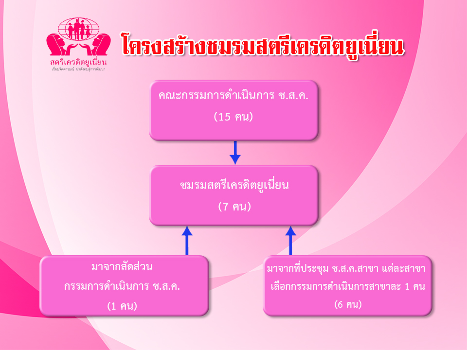 ระเบียบชุมนุมสหกรณ์เครดิตยูเนี่ยนแห่งประเทศไทย จำกัด ว่าด้วย ชมรมสตรีเครดิตยูเนี่ยน พ.ศ. 2560 หมวดที่ 5 ข้อที่ 15 ให้คณะกรรมการดำเนินการแต่งตั้งกรรมการสตรี จำนวน 7 คน โดยแต่งตั้งจากกรรมการดำเนินการชุมนุมสหกรณ์เครดิตยูเนี่ยนแห่งประเทศไทย จำกัด หนึ่งคน และให้เลือกตั้งจากผู้แทนสหกรณ์ที่เป็นสตรีจากที่ประชุมใหญ่ชุมนุมสหกรณ์สาขา สาขาละหนึ่งคน และให้คณะกรรมการสตรีเลือกตั้งระหว่างกันเองเพื่อคัดเลือกตำแหน่งประธานคนหนึ่ง รองประธานคนหนึ่ง เลขานุการคนหนึ่ง เหรัญญิกคนหนึ่ง นอกจากนั้นเป็นกรรมการ |